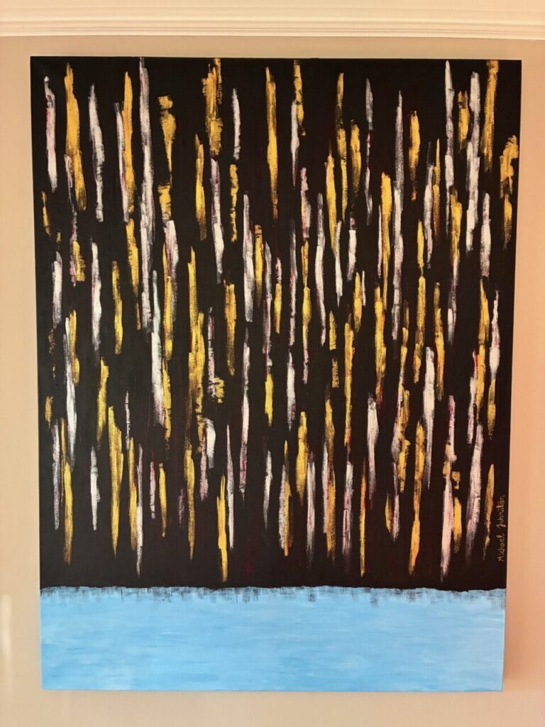 Eclipse: Acrylic on canvas, 36’’ x 48”. Darkness descends with shards of gold and silver, streaked with crimson, representing the oppressive and destructive nature of money and greed, which increasingly infiltrates and obscures any calm and peaceful state of mind.
