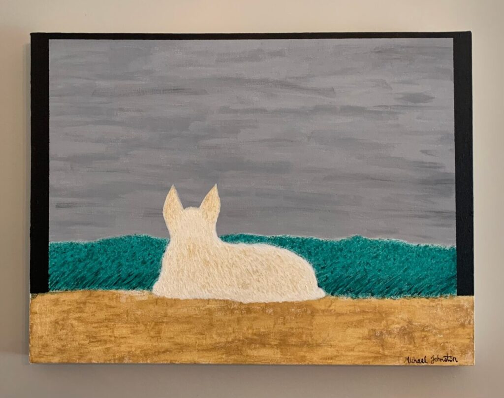 Tinker at Her Post: Acrylic on canvas, 18” x 24”. Our beloved chihuahua is central in representing what we all feel or desire at some point in our journey: a longing for the outside world and its adventures, the comfort of a safe home, and the steady vigilance to guard what is most important to us.