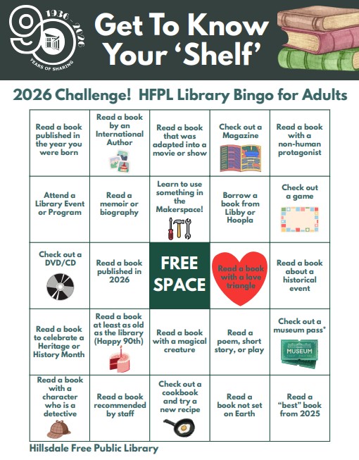 Play our bingo challenge and earn prizes! You can help us celebrate the library’s 90th anniversary by playing the 2026 HFPL Bingo Challenge.(There’s an Teen version too!)
